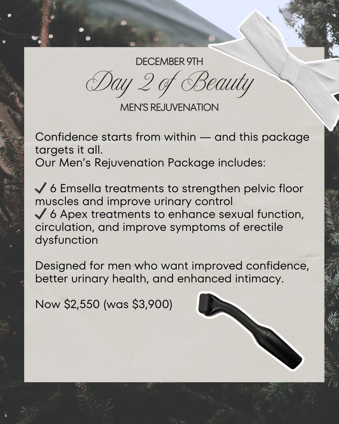 Our Men’s Rejuvenation Package combines 6 Emsella sessions for pelvic floor strength + improved bladder control, with 6 Apex treatments to support circulation, performance, and erectile function. Now $2,550 (was $3,900).